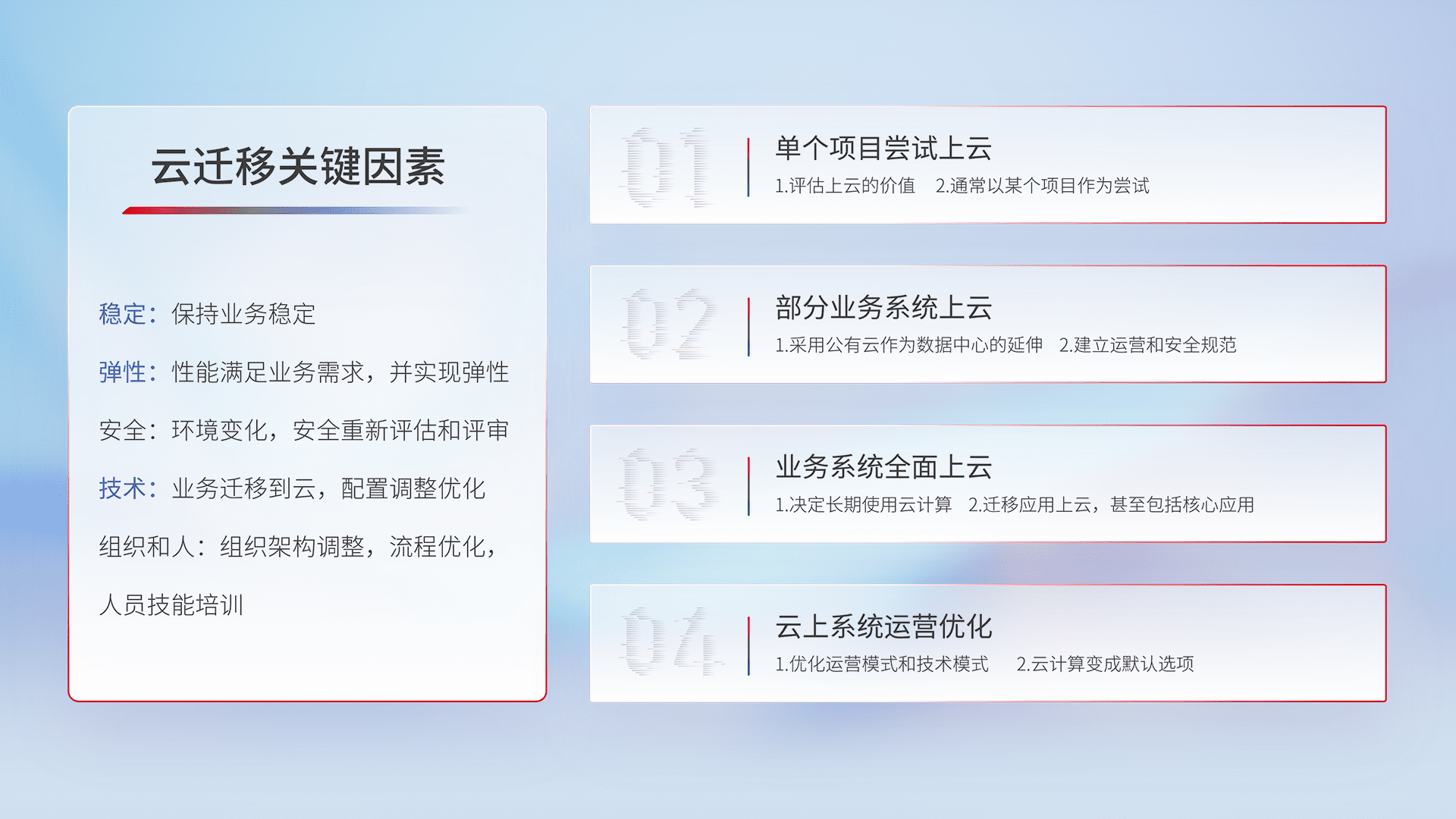 结合实际业务,,,从规划设计、、、云平台选型、、、、云原生改造、、数据迁移、、、、集成交付,,迁移全过程为客户识别最佳上云路径,,,做好风险识别管理,,,设计网络架构、、身份权限、、、安全审计合规、、操作审计、、、日志审计、、、监控告警策略、、、、多站点容灾设计等,,对云上基础设施进行整体规划,,,提升IT治理水平,,,以满足弹性、、、高可用、、、高性能的需求。。