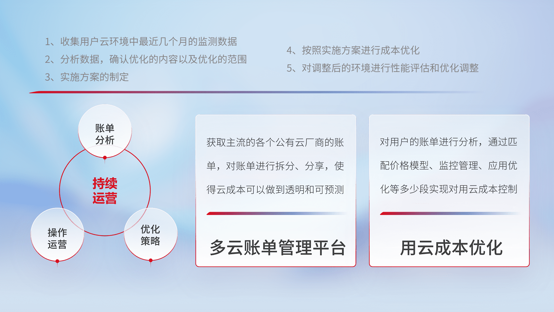 通过多云纳管,,,以统一的资源数据模型把客户的云资源进行抽象和封装,,,,进而实现对多云资源的统一操作,,,保障云资源管理的可靠性、、稳定性与可用性。。。量身定制化运维内容,,,配置、、开发运维、、、补丁管理、、、备份、、监控、、、认证和访问管理、、审计和日常巡检等,,保障在用云过程中的可靠度,,稳定度以及高可用率。。。。